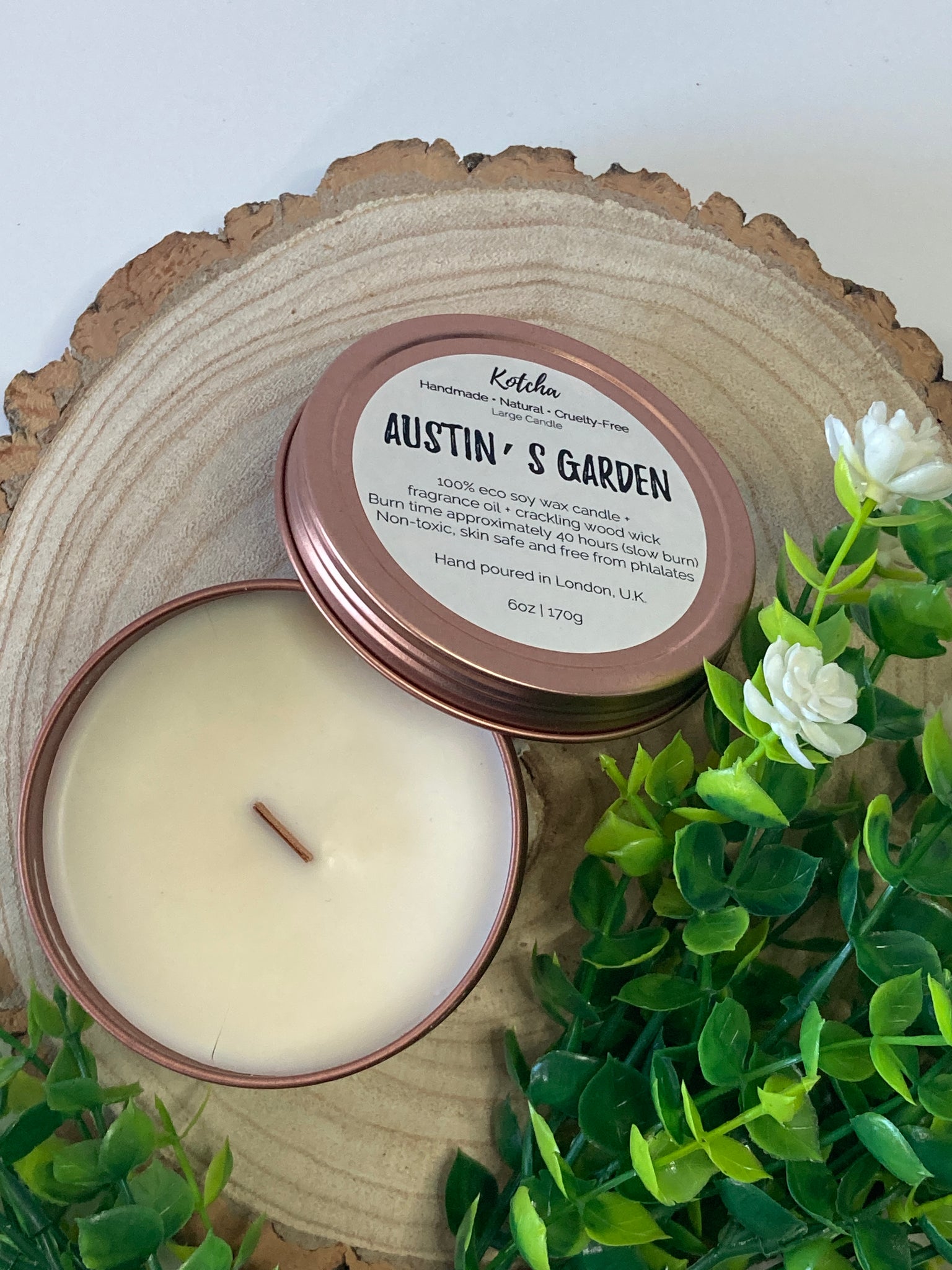 All Kotcha candles are made using only premium quality 100% natural eco soy and 100% natural eco coconut wax. Each candle is made with a crackling wood wick. All waxes are loaded with the maximum per cent of premium fragrance oil to fill your home with a strong and lasting scent. They are non-toxic, phthalate free, skin safe and slow-burning. The design and size of the tin makes it perfect for gifting, travelling and it suits any style of decor. Burn time: 45 hours.